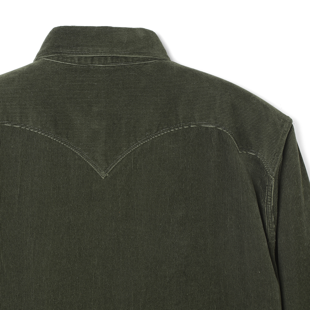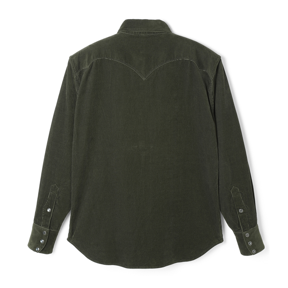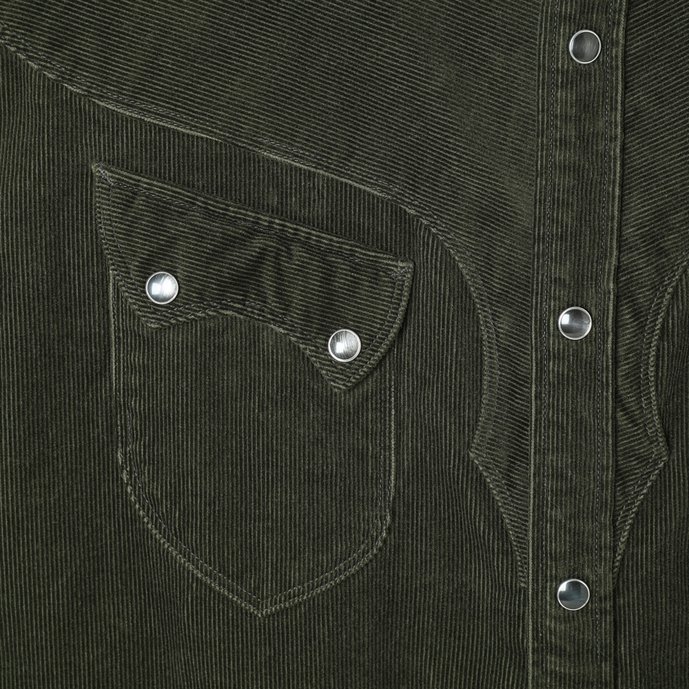 The 16-wale fine corduroy fabric is known for its subtle sheen and unique texture, making it a high-quality material. It pairs well with the distinct design of Western shirts, offering a classic yet timeless appearance.