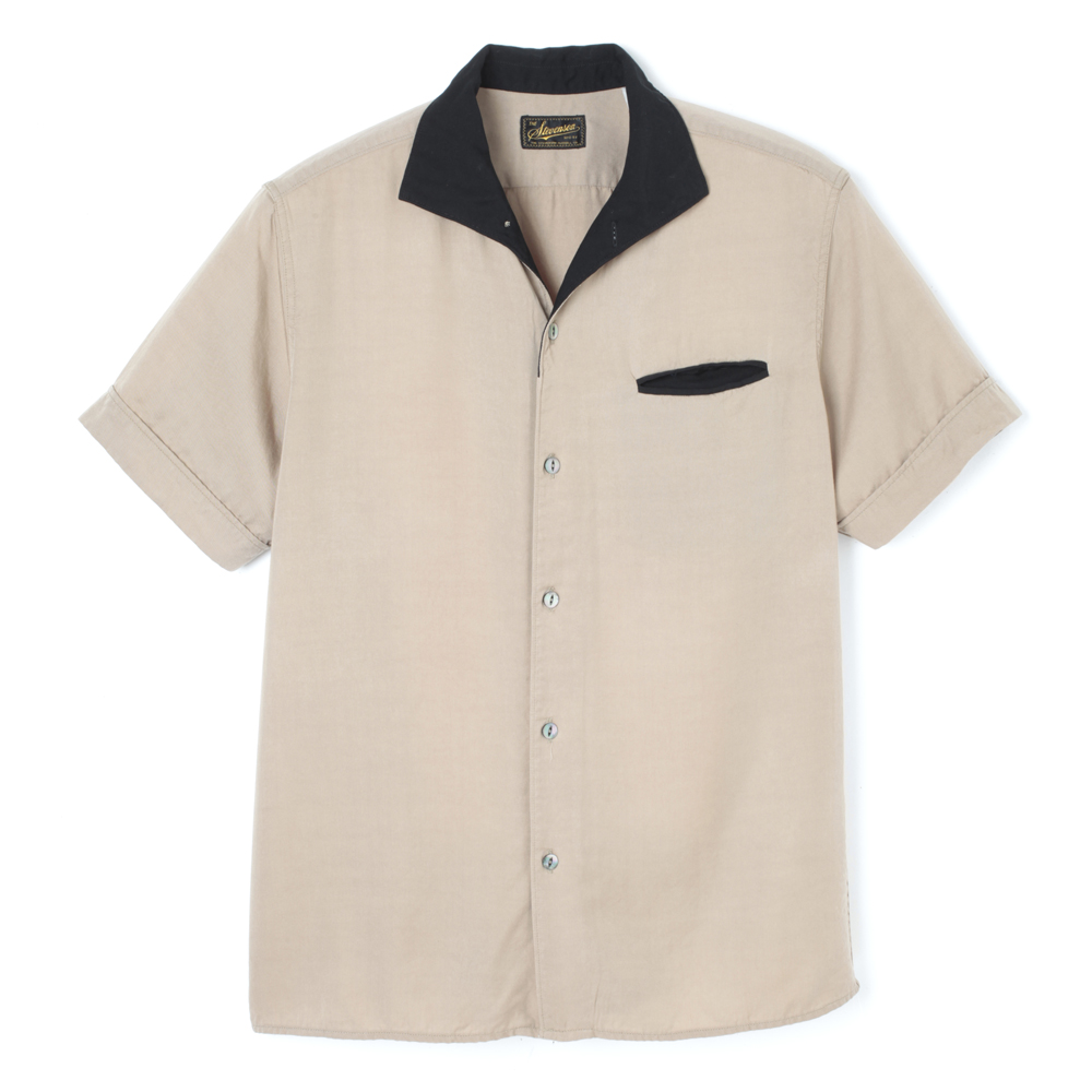 【ITALIAN COLLAR SHIRT】襟とポケット口を配色にしたイタリアンカラーのショートスリーブシャツです。ゆとりのあるシルエットですが後見頃に大きなダーツを入れウエストをシェイプさせています。着用時にはスッキリとしたシルエットになります。